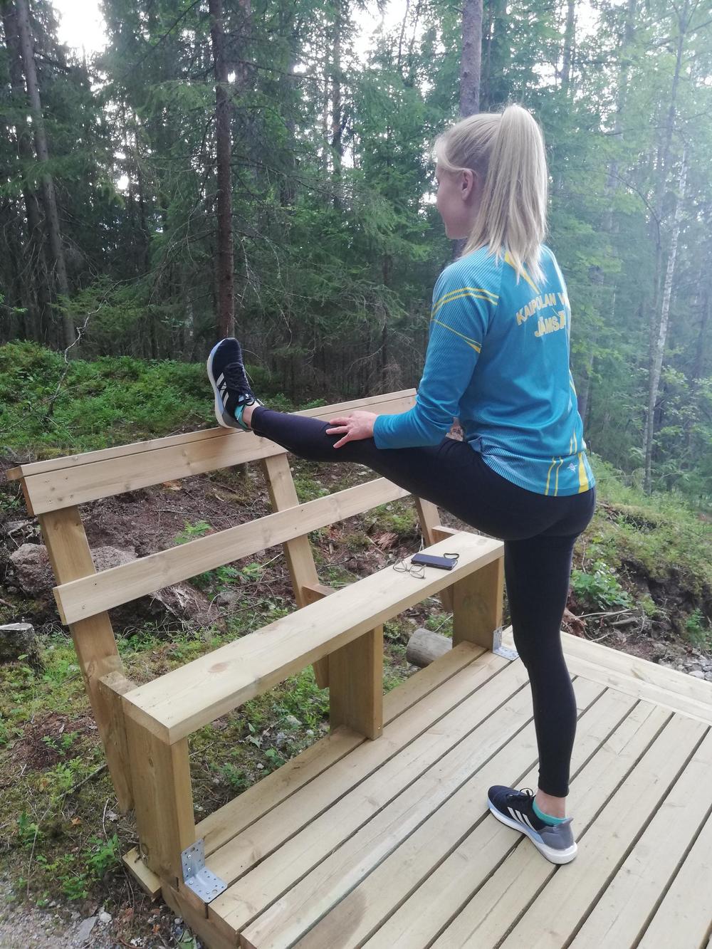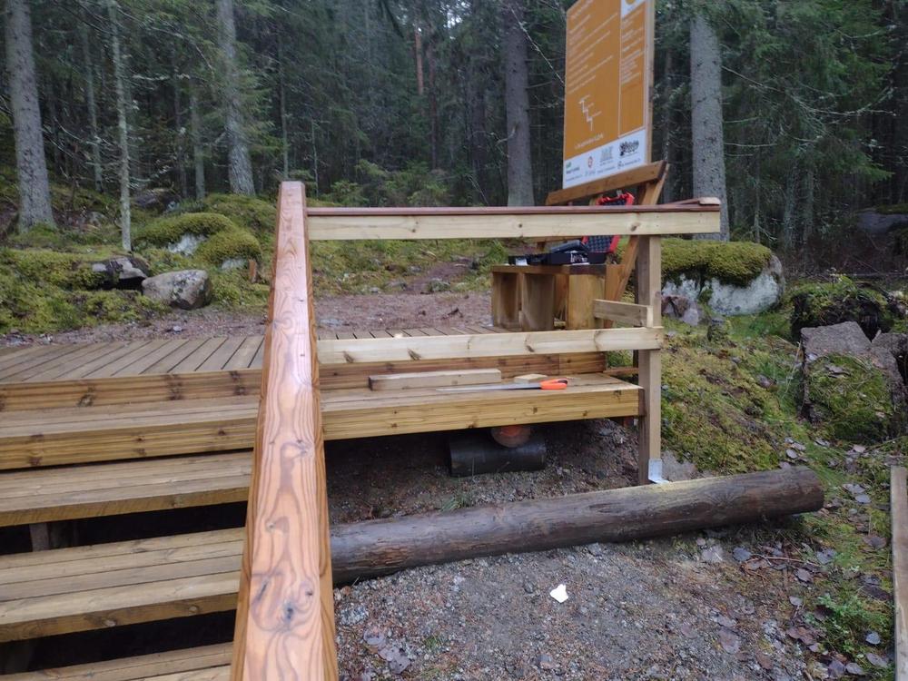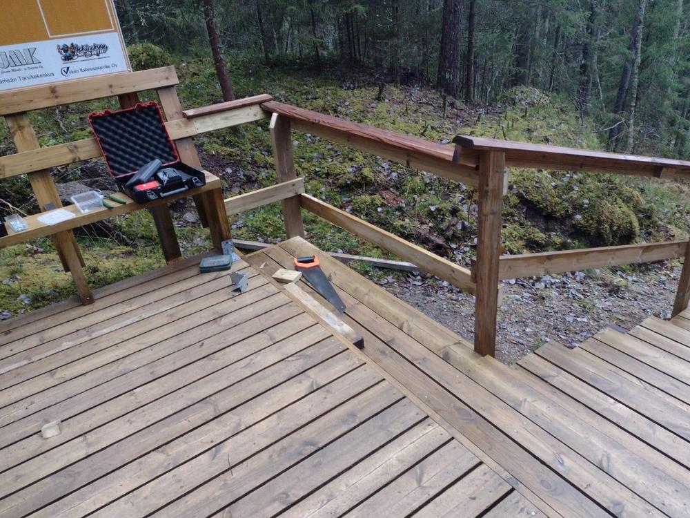 Viimeisenä viimeistelytyönä naulattiin kaide kuntoportaiden ylätasanteelle 4.11.2021