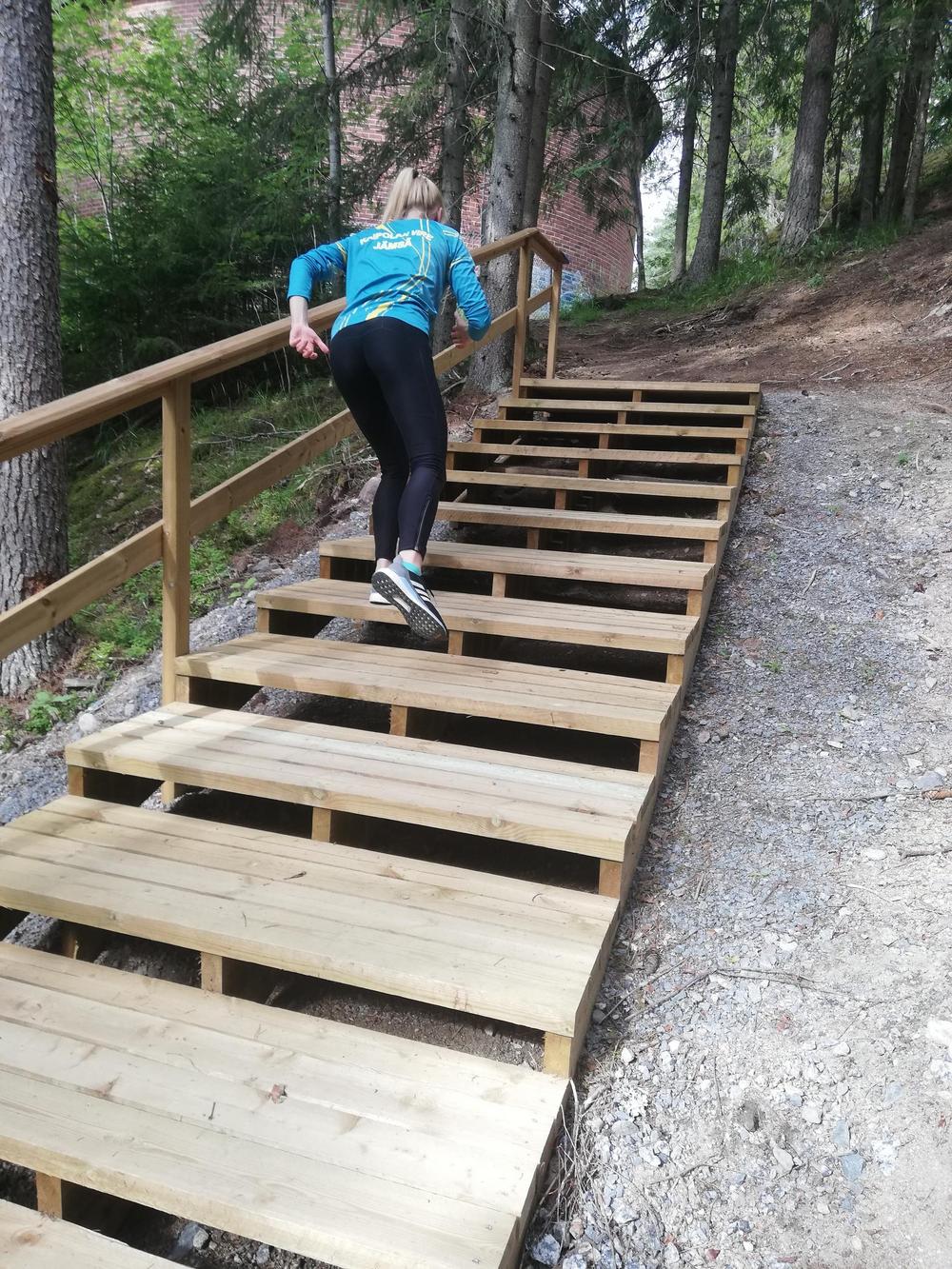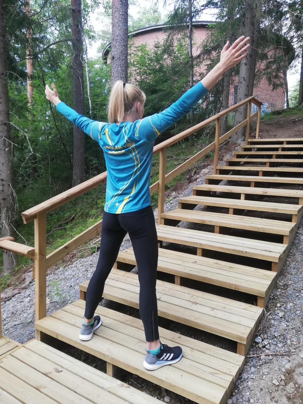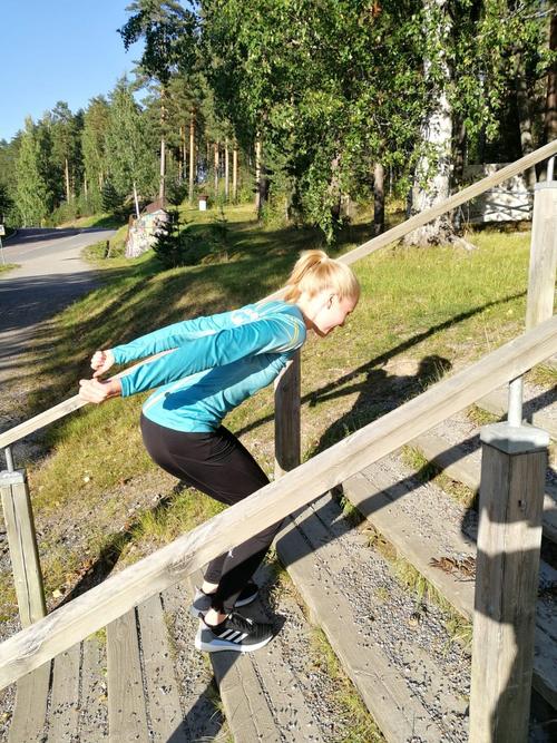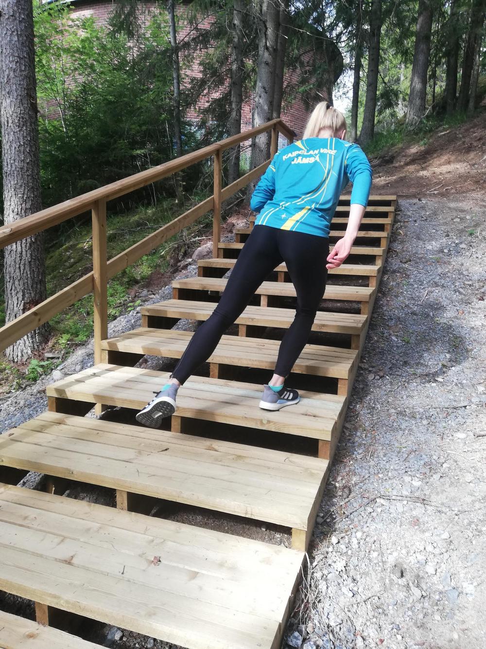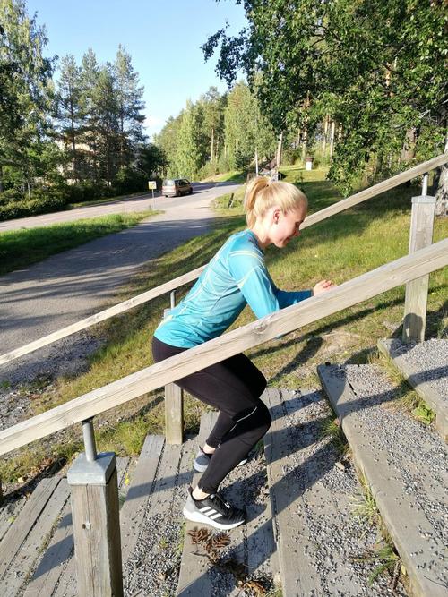 - kyykkyhypyillä: ponnista molemmilla jaloilla yht`aikaa 1 - 3 porrasväliä ylöspäin joko yhtäjaksoisesti tai pienellä pysähdyksellä. Voit edetä myös tekemällä 2 tasahyppyä ylöspäin + 1 tasahyppy alaspäin. Voit tehostaa liikettä heilauttamalla käsiäsi yhtaikaa takaa eteen ylös tai pitämällä käsiäsi koko ajan vartalon edessä, jolloin voit ottaa käsiisi jopa lisäpainon.