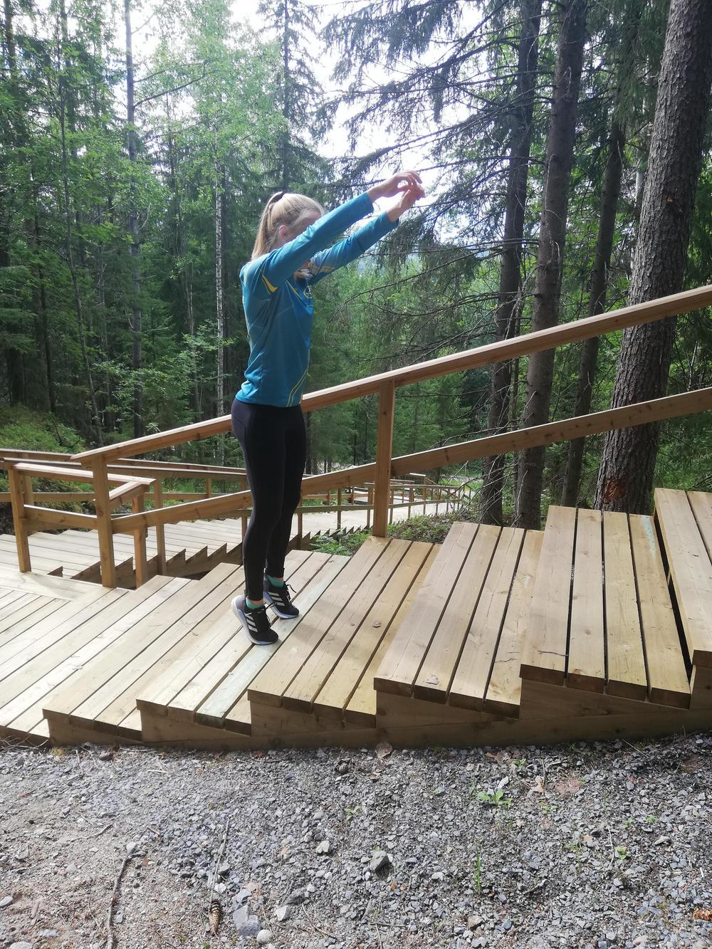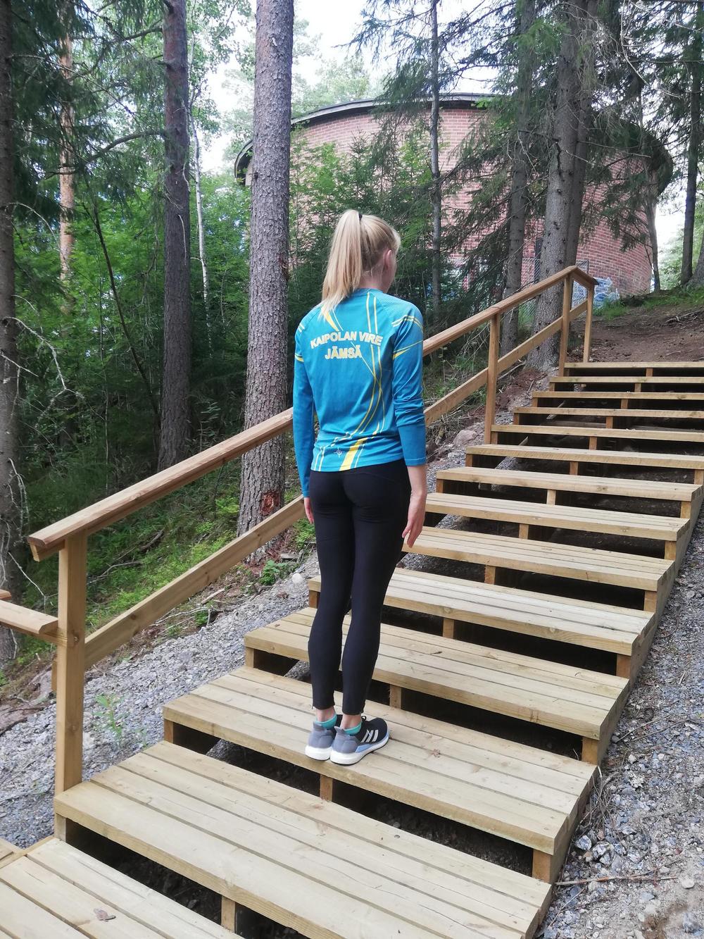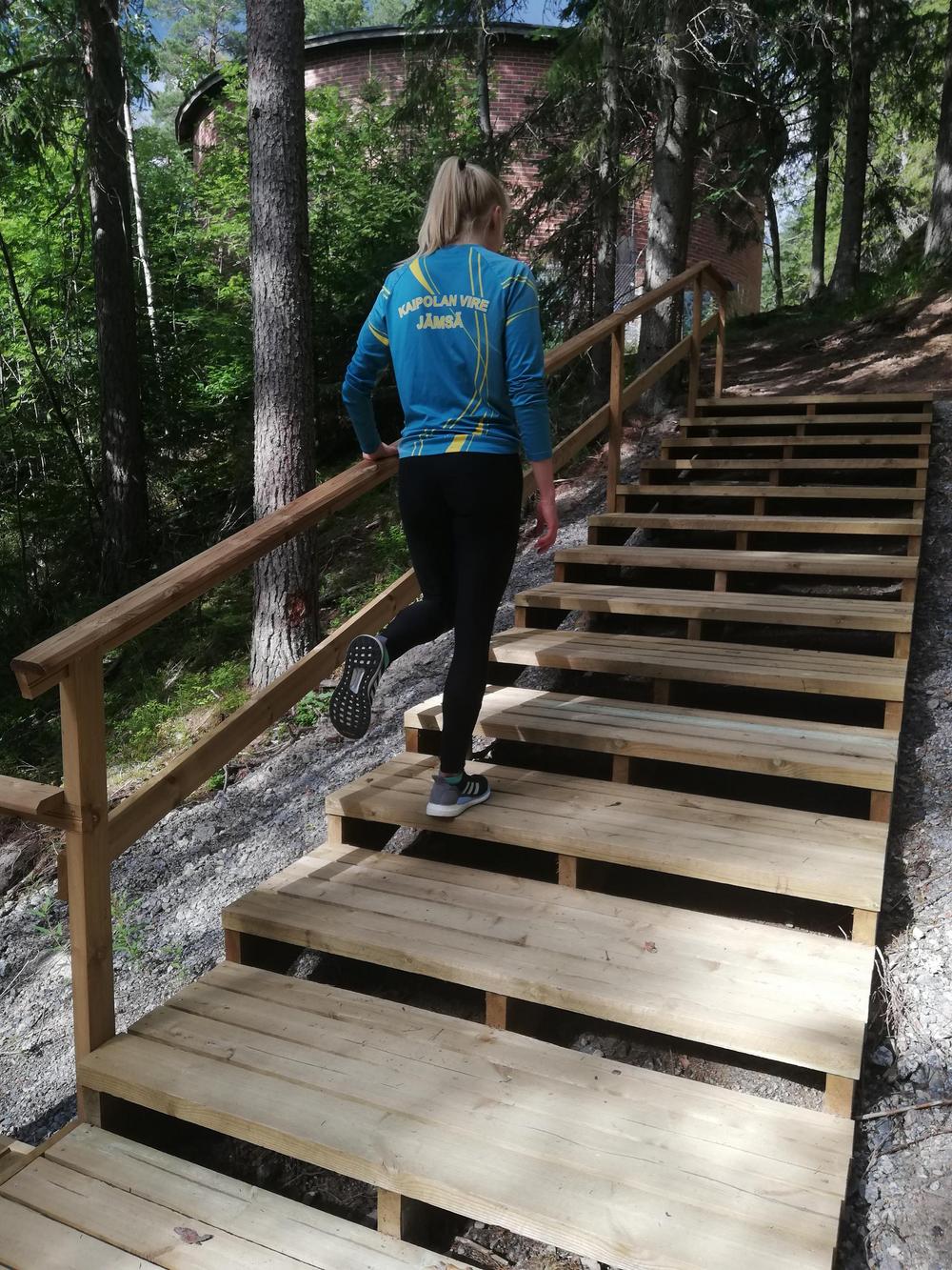 - kyykkyhypyillä: ponnista molemmilla jaloilla yht`aikaa 1 - 3 porrasväliä ylöspäin joko yhtäjaksoisesti tai pienellä pysähdyksellä. Voit edetä myös tekemällä 2 tasahyppyä ylöspäin + 1 tasahyppy alaspäin. Voit tehostaa liikettä heilauttamalla käsiäsi yhtaikaa takaa eteen ylös tai pitämällä käsiäsi koko ajan vartalon edessä, jolloin voit ottaa käsiisi jopa lisäpainon.