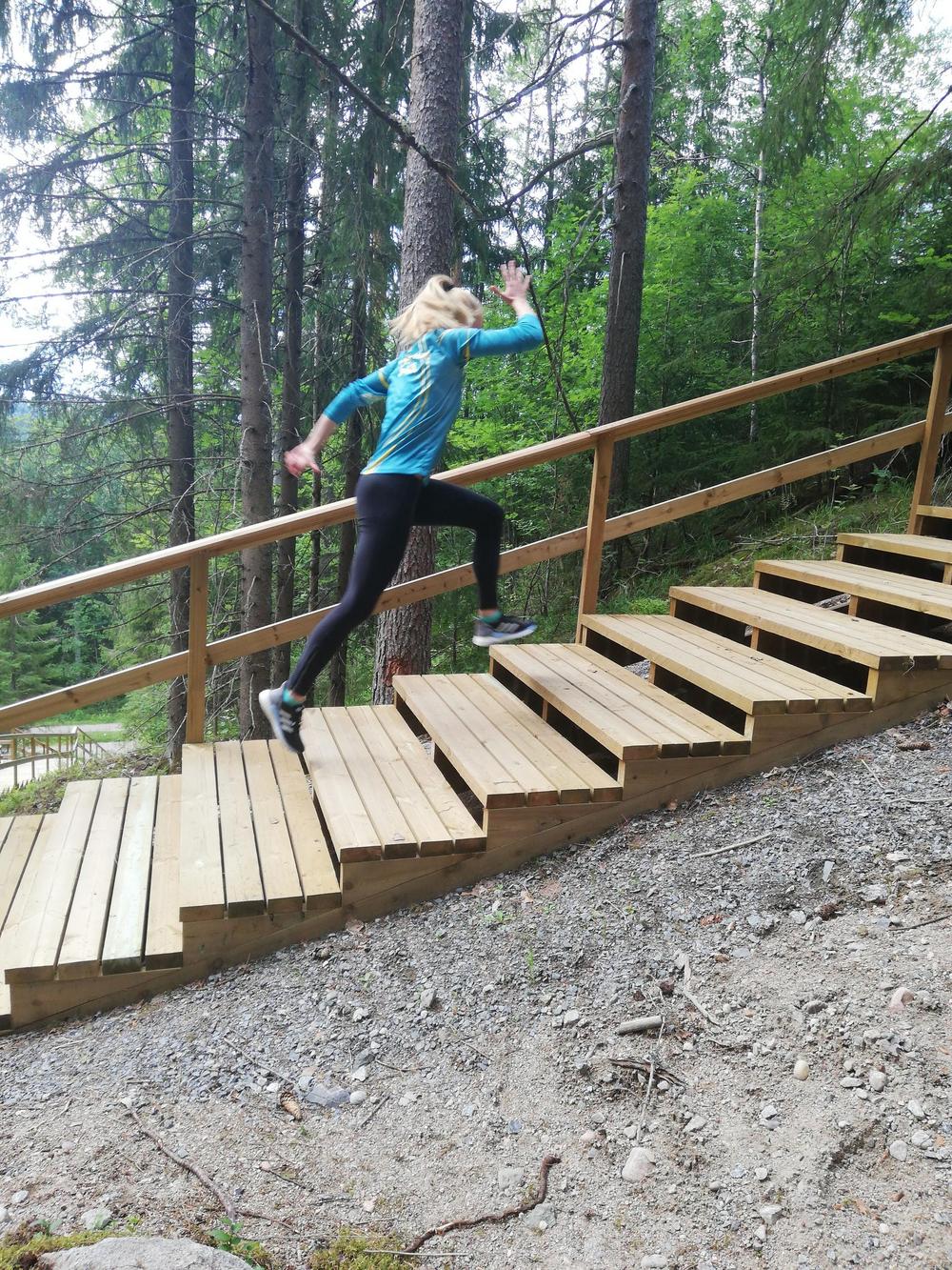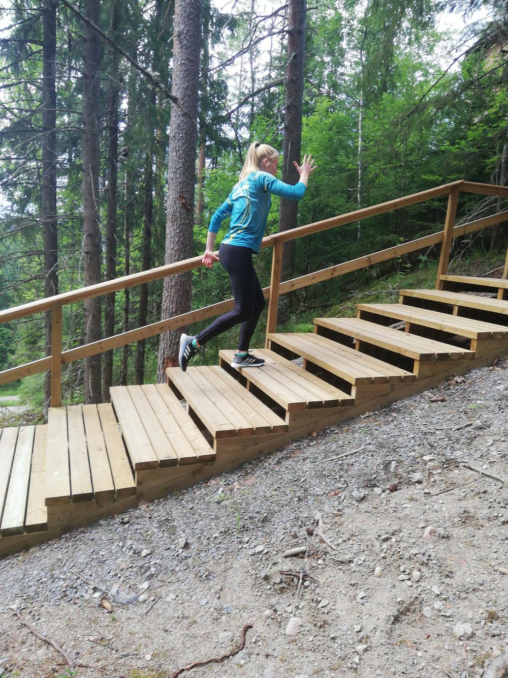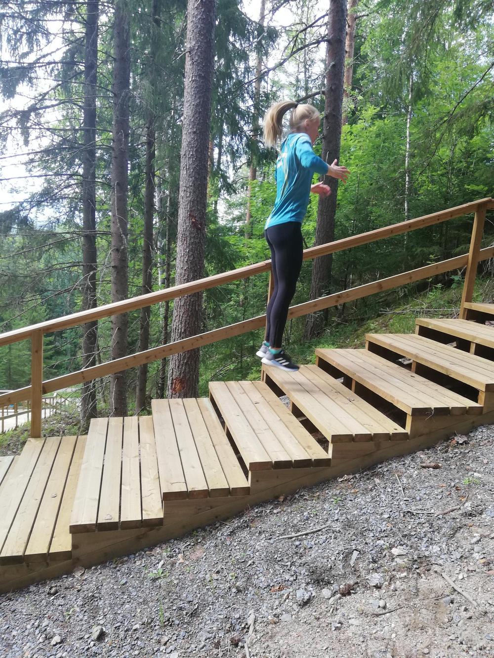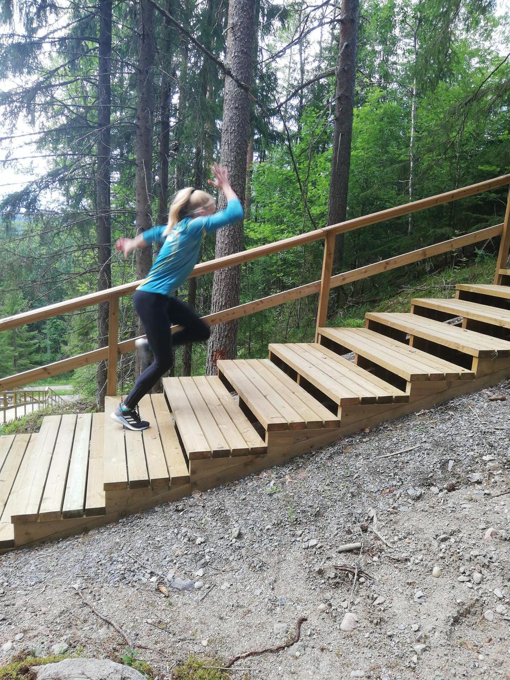 - luisteluloikilla: ponnista aina 2 -3 porrasväliä ylöspäin ja hiukan sivulle. Muista jousto polvissa. Pysähdy ja hae hyvä tasapaino ennen seuraavaa hyppyä.