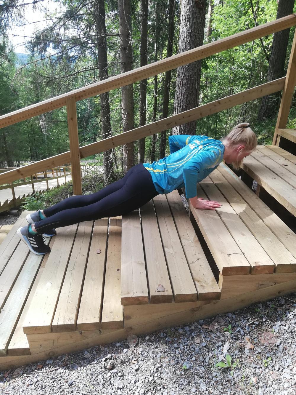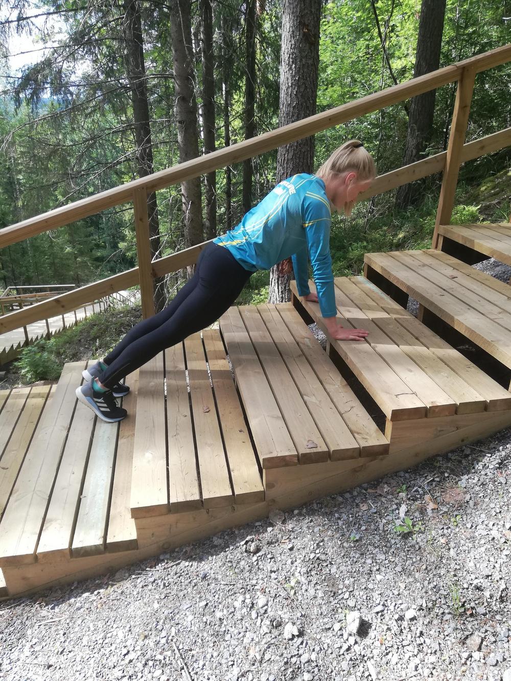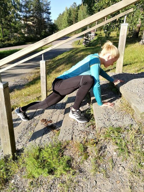 - etunojapunnerruksia, portaissa alaspäin asennossa: asetu punnertamaan siten, että jalkasi ovat ylemmällä portaalla ja kädet alemmalla portaalla!