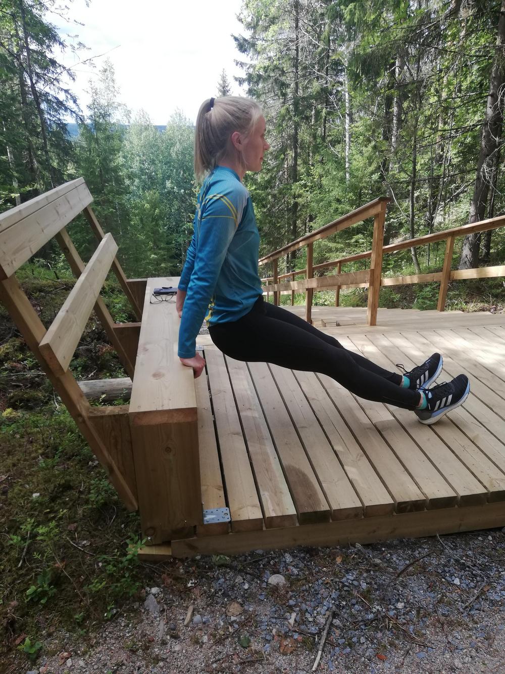 - dippipunnerruksia: Ota hieman hartioita leveämpi ote portaisiin. Pidä vatsa jännitettynä, laskeudu alas niin, että kyynärpäät koukistuvat ja punnerra ylös.