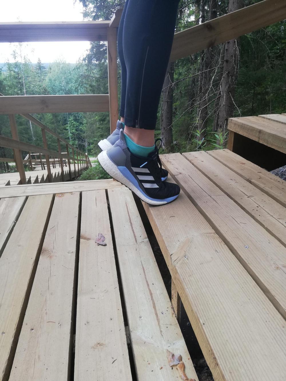 - pohjenousuja: pidä kaiteesta kiinni ja siirry portaan reunalle. Vie kantapäät alas ja nouse sieltä varpailleen. Toista tämä 15 kertaa, pidä pieni tauko ja tee toinen sarja perään.