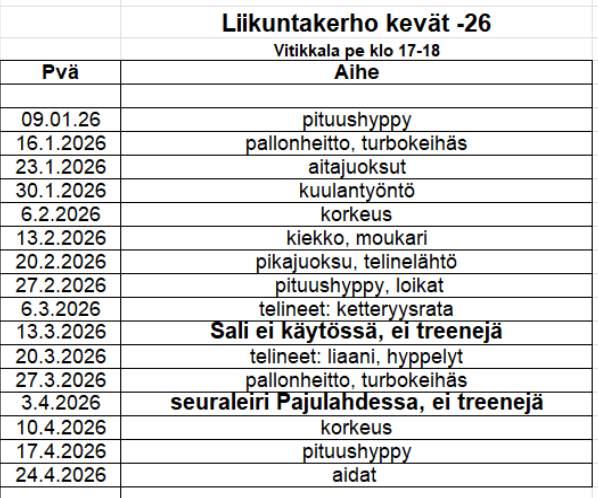 Käytä lapsi wc:ssa ennen tunnin alkua. Ulkoilukerroille sään mukaiset, liikkumiseen soveltuvat varusteet.
